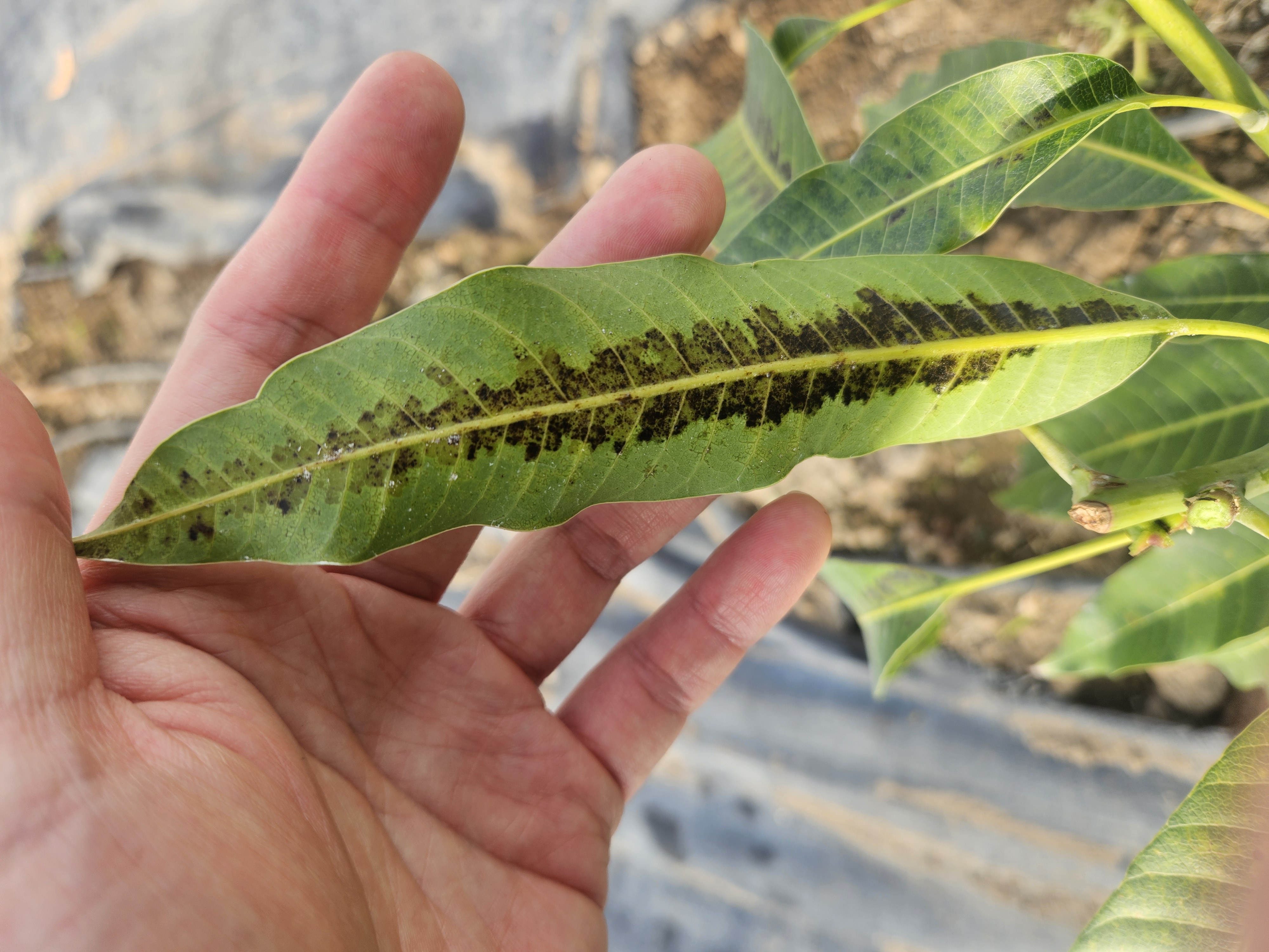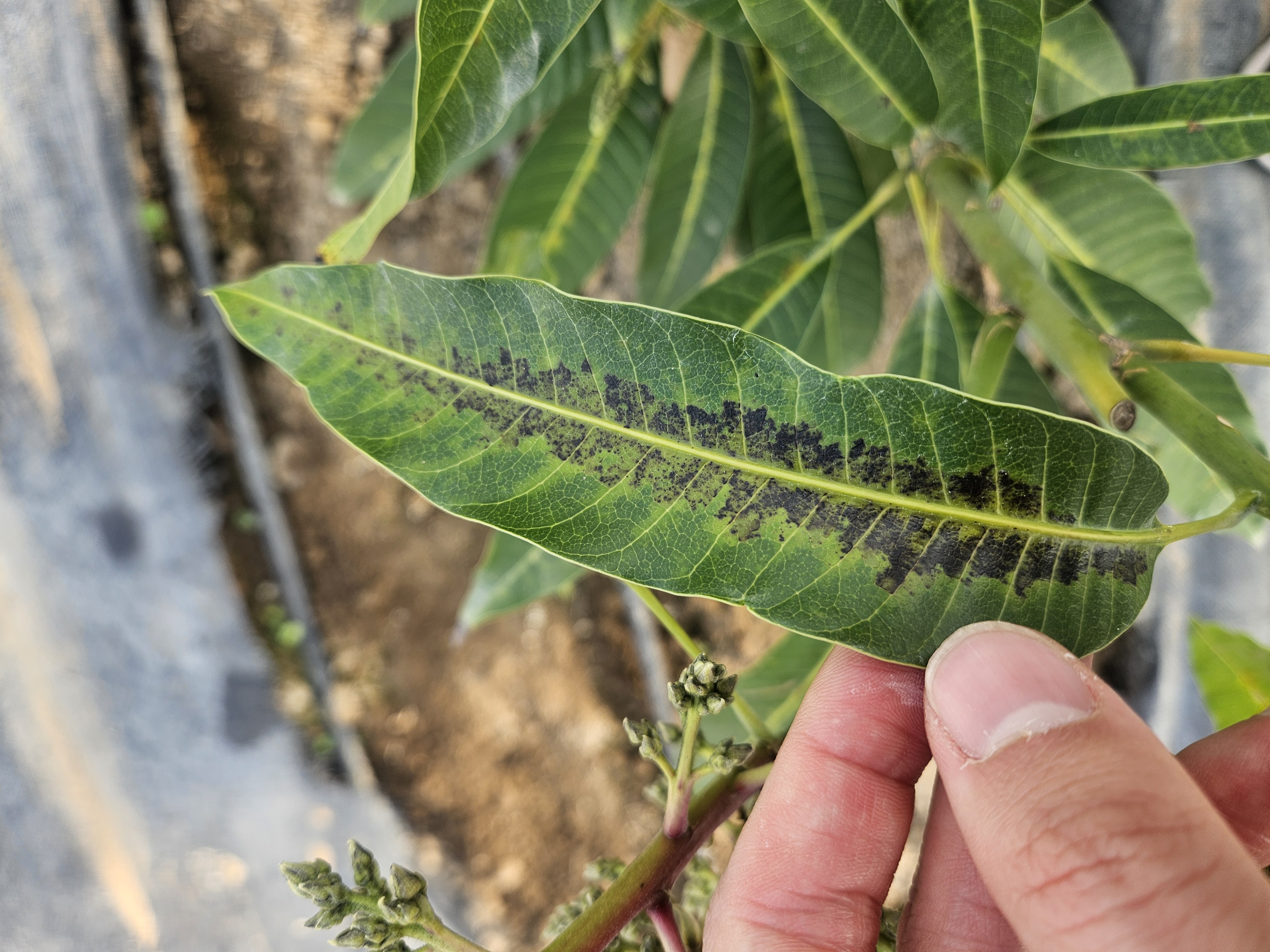안녕하세요. 내륙지역에서 애플망고를 재배하고 있습니다. 작년 11월 묘목을 구입하여 심고 1주일에 한번 15분 정도 점적관수를 하고 있습니다. 처음 묘목을 살때도 사진과 같은 피해가 보여 잎 뒷면을 확인 해보니 깍지벌레 같은 해충이 보여 3회 방제 하였습니다. 모두 다른 계통을 사용하였구요. 그런데도 이 무늬같은 피해는 사라지지 않고 유지되거나 더욱 커지고 있습니다. 묘목 심기 전인 9월에 1년 추가로 부숙 시킨 가축분퇴비와 토양을 섞어 주는 작업을 하였고 유박비료도 조금 내었습니다. 원인이 무엇인지 알고 싶습니다.